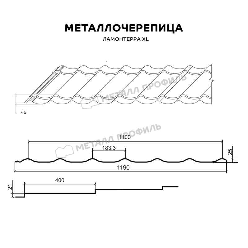 Если вам нужна классическая металлочерепица для крупных крыш, остановите выбор на Ламонтерра® XL. Она характеризуется увеличенными размерами: длина ступенек — 400 мм, а высота — 21 мм. Крупные плавные волны подчеркнут форму ската и сделают крышу более эффектной.