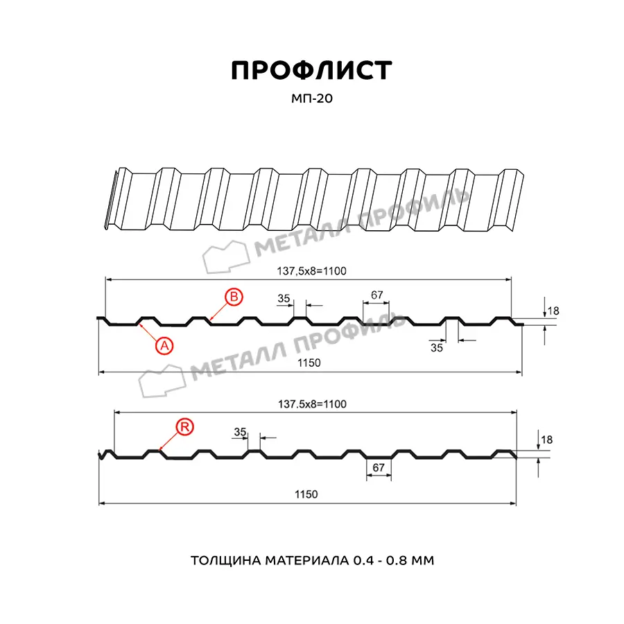 Профлист МП-20 относится к многофункциональным cтройматериалам. В сравнении с другими модификациями профлиста, этот выпускается в трёх вариациях: А, В и R. Разновидности А и В используются для кровельных работ, монтажа заборов, облицовки стен, для внутренней обшивки складских помещений, гаражей, ангаров и т.п. Вариант с буквой R отличается присутствием капиллярной канавки и используется для обустройства кровли. В зависимости от зоны применения, МП-20 изготавливается из оцинкованной стали толщиной от 0,4 до 0,8 мм. Важная деталь: хоть в названии указана цифра 20, реальная высота этого профиля – 18 мм. Это материал бюджетной ценовой категории и обладает доступной ценой. МП-20 – прочный и долговечный стройматериал, характеристики которого по достоинству оценивают не только частные домовладельцы, но и крупные застройщики. Он отличается хорошей несущей способностью, выдерживает большие статические нагрузки и эффективно противостоит нагрузкам динамическим.